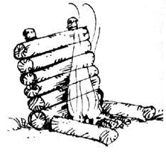 de pirámide y se colocan cinco troncos alrededor de este, con uno de sus